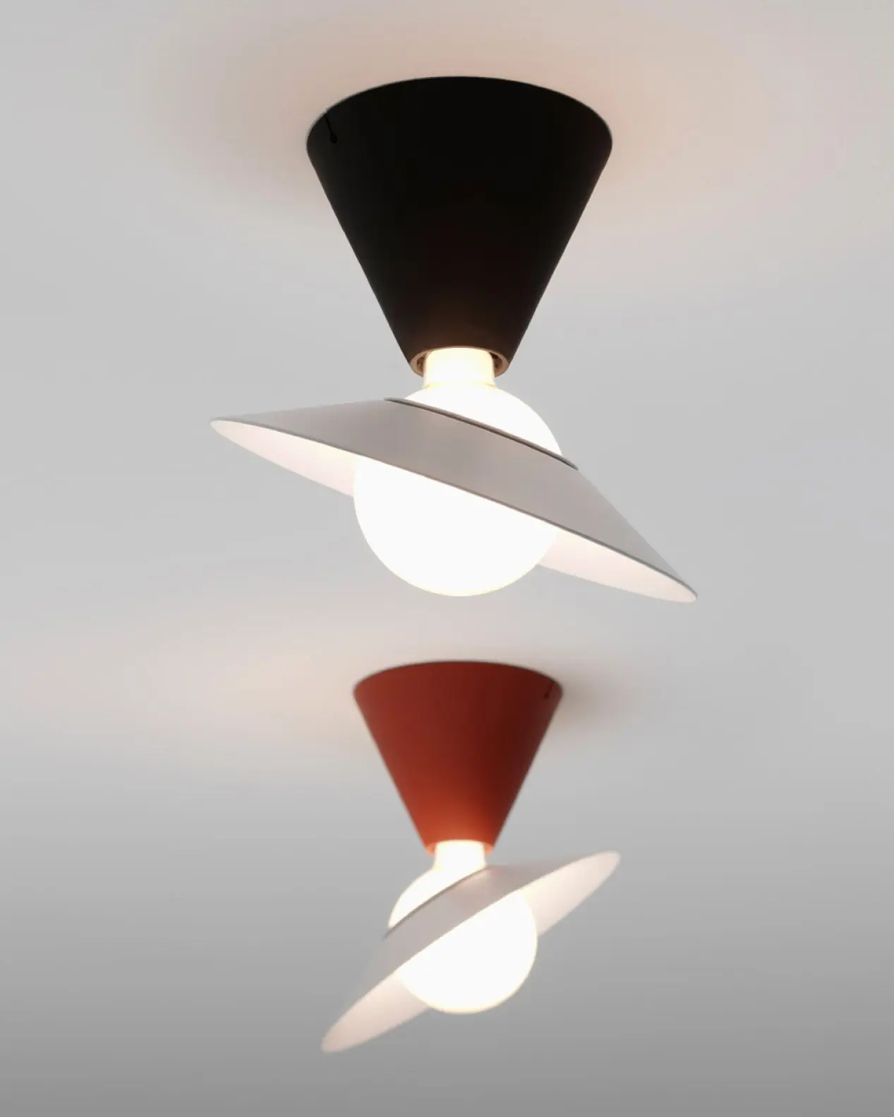 Base conica in silicone disponibile nei colori nero o rosso mattone. Disco orientabile in alluminio verniciato bianco. Lampada globo LED 11W 2700K E27 inclusa.