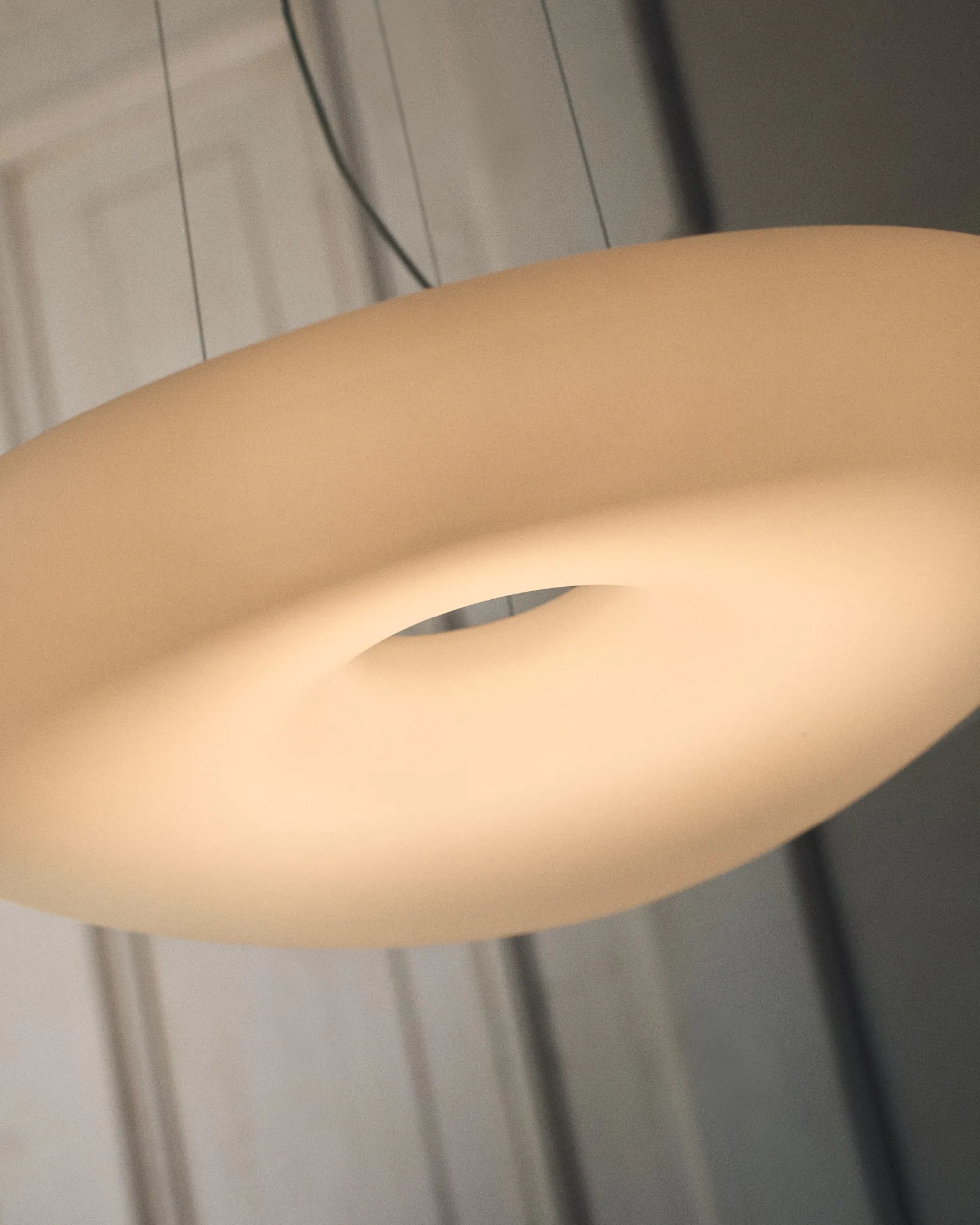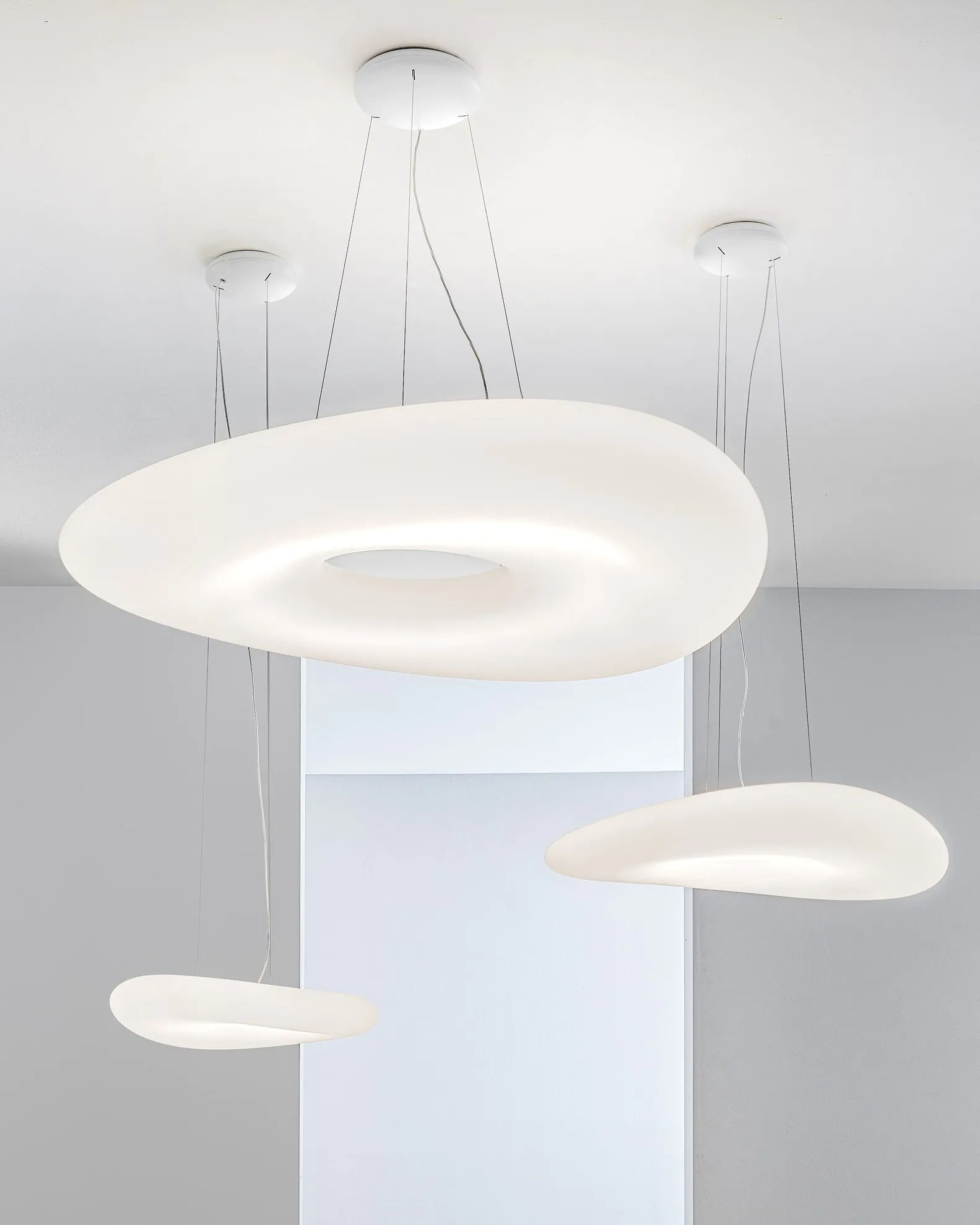 Il diffusore in polietilene bianco esalta le forme fluide della lampada, mentre il coprifilo in metallo verniciato bianco e i cavi di sospensione in acciaio garantiscono stabilità senza appesantire la composizione.
