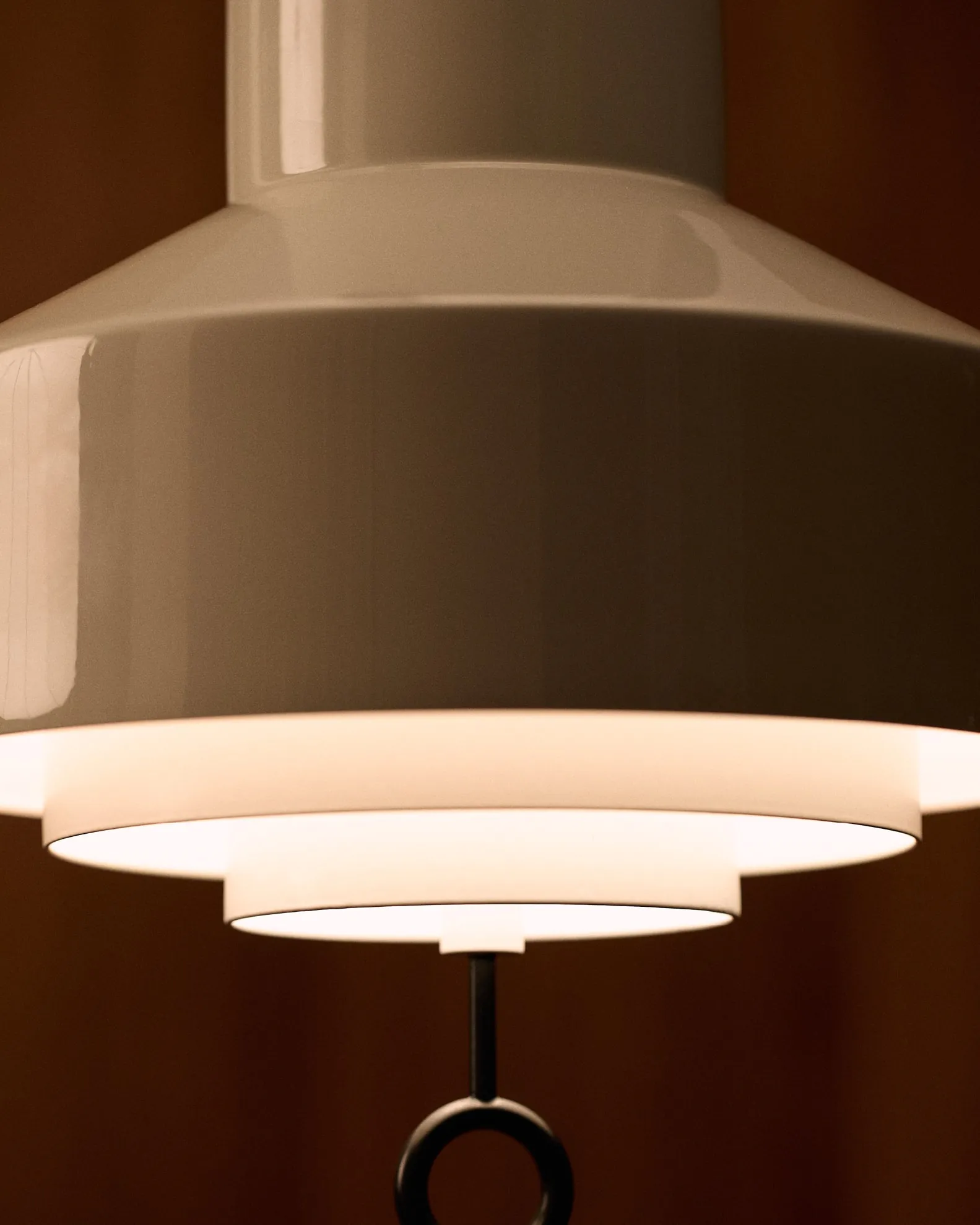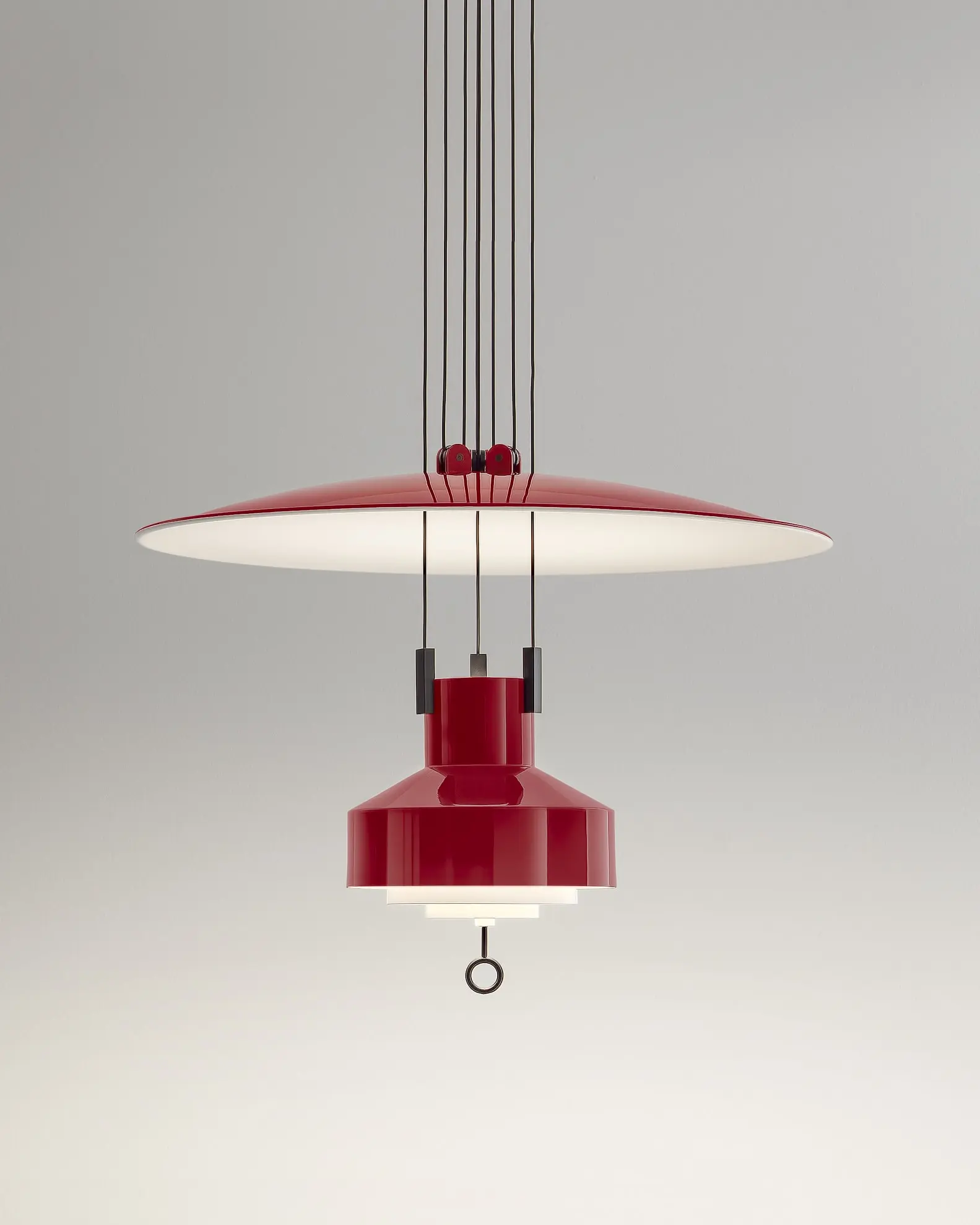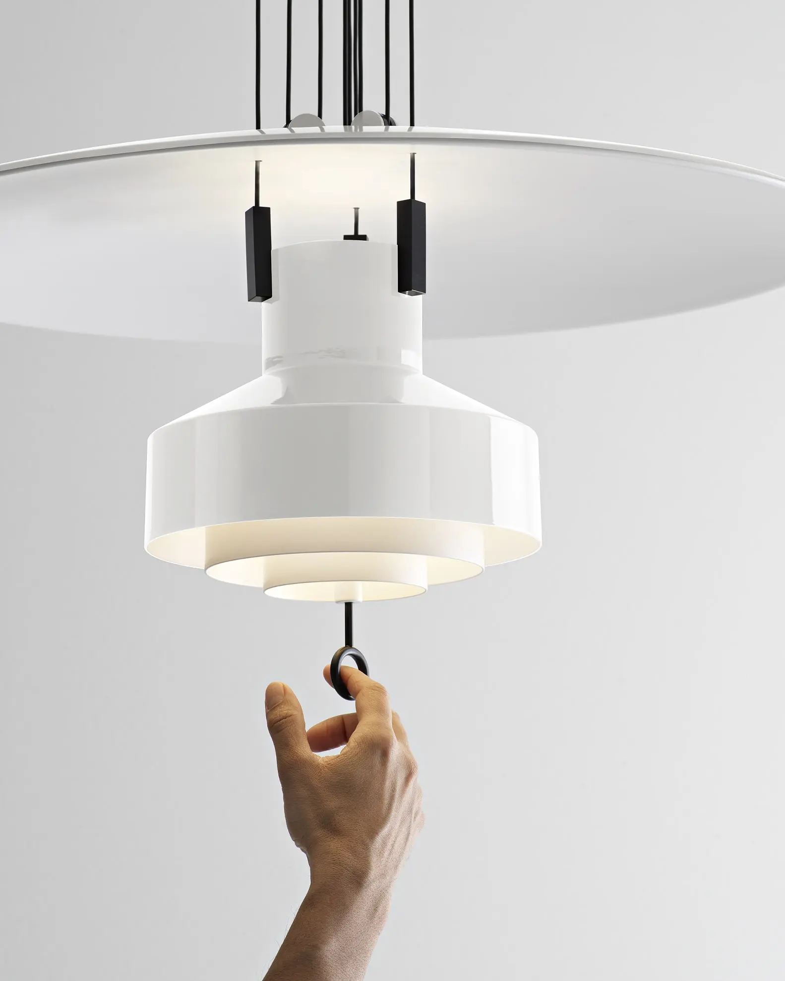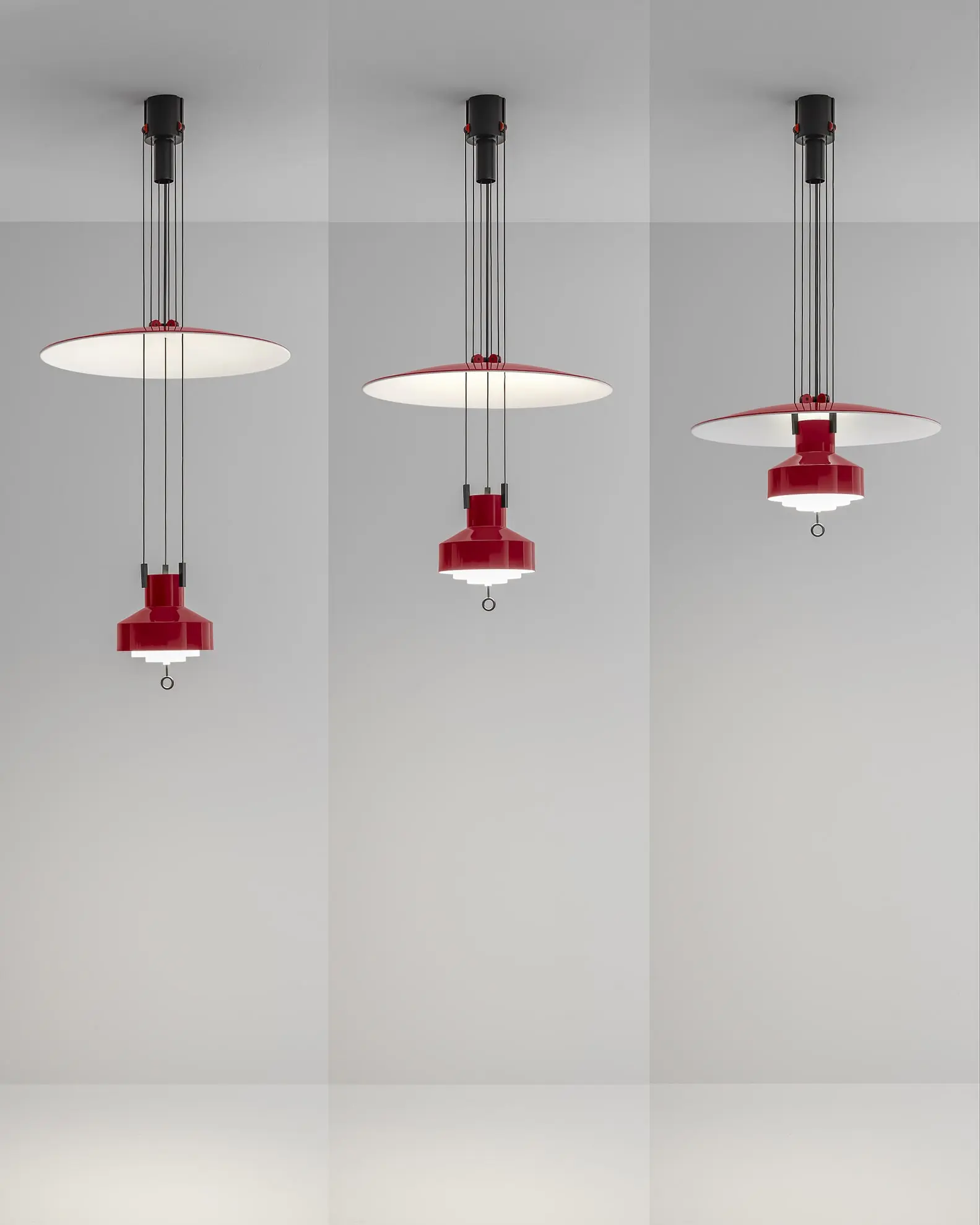 Disegnata nel 1957 e premiata con la Menzione d’Oro al Compasso d’Oro ADI, Saliscendi è una lampada a sospensione regolabile a doppia emissione, capace di modulare la luce diretta e indiretta con un semplice gesto. Il corpo luminoso e il disco riflettente scorrono lungo i cavi in movimento inverso, offrendo un’illuminazione dinamica e personalizzabile. Realizzata in origine per la Camera di Commercio di Milano, oggi Saliscendi viene riproposta con sorgenti LED dimmerabili, mantenendo intatta la genialità del progetto originale.