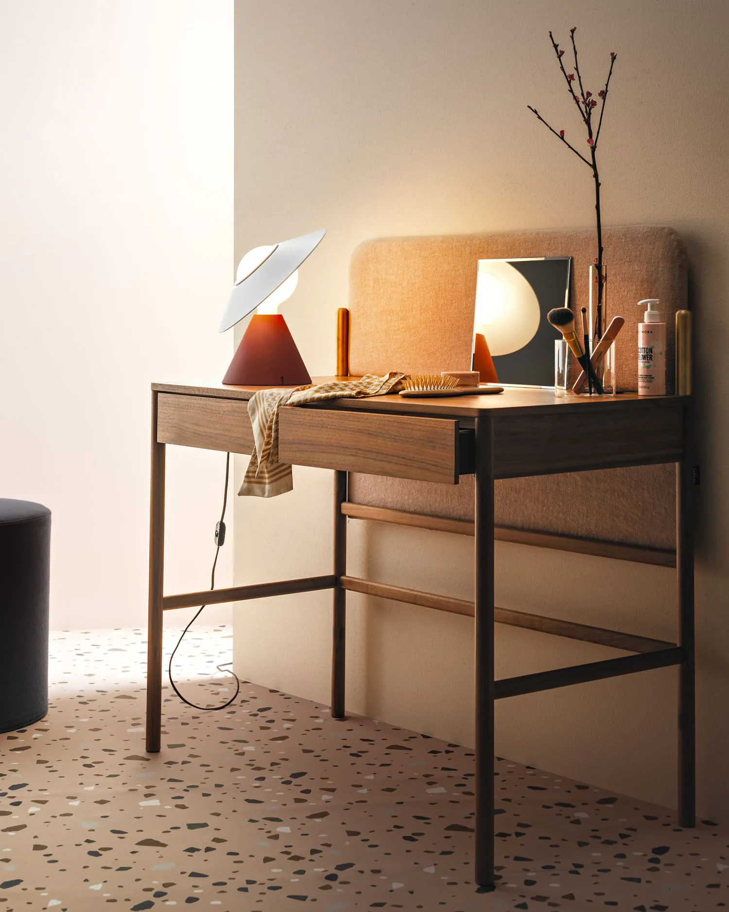 Grazie alla possibilità di inclinazione del riflettore, Fante permette di dirigere la luce direttamente sul piano d’appoggio, mentre una delicata luce diffusa si espande verso l’alto, creando un’atmosfera accogliente.