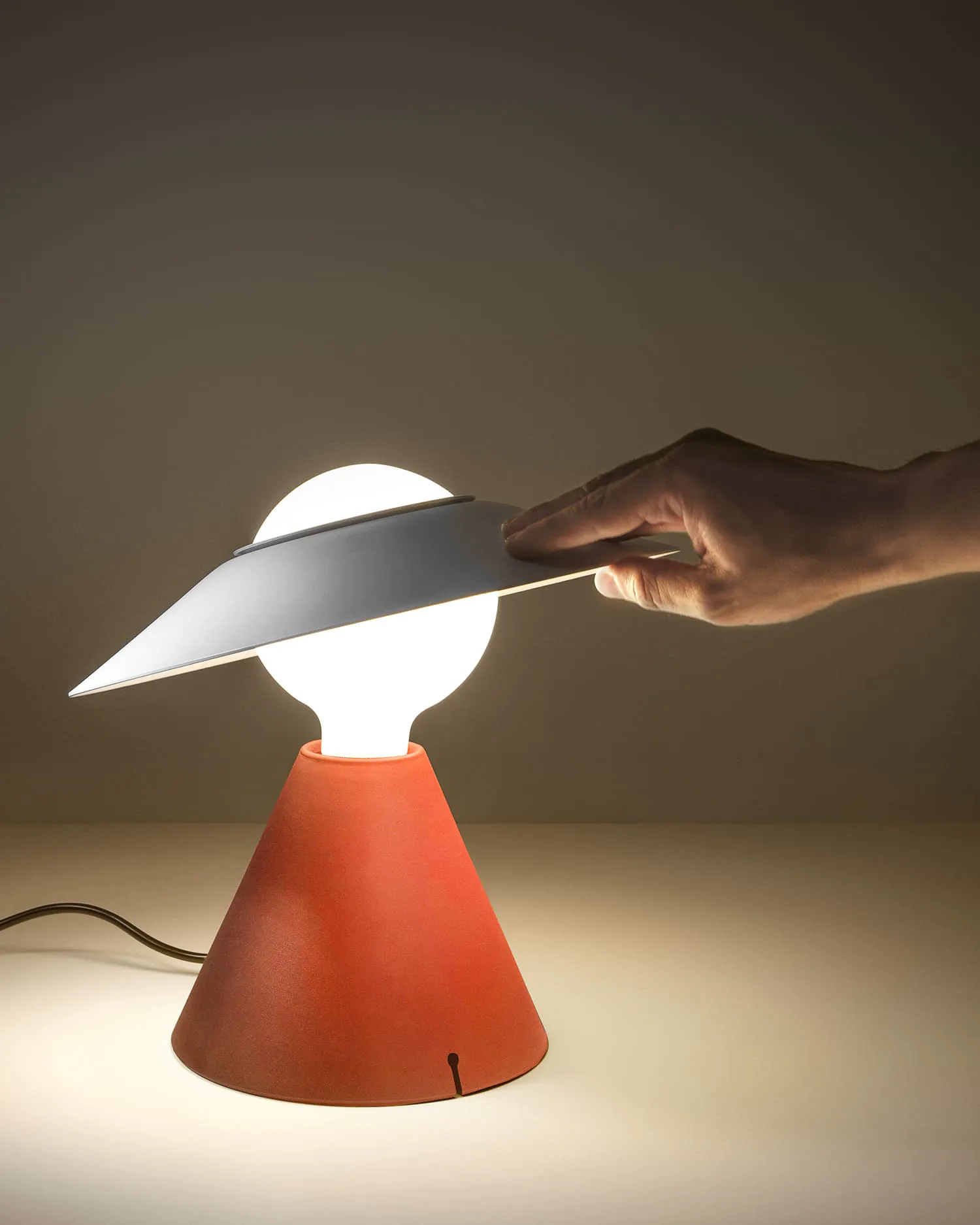 La base conica in morbido silicone, disponibile in nero o rosso mattone, offre un’esperienza tattile piacevole. Il riflettore in alluminio verniciato bianco è inclinabile per personalizzare l’illuminazione con semplicità.