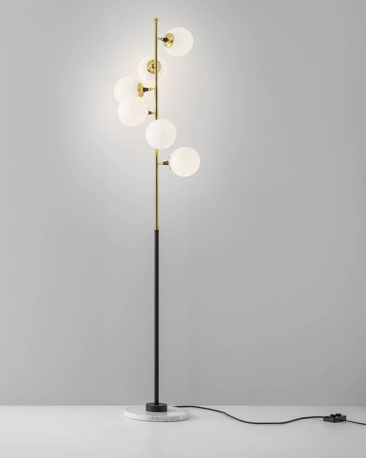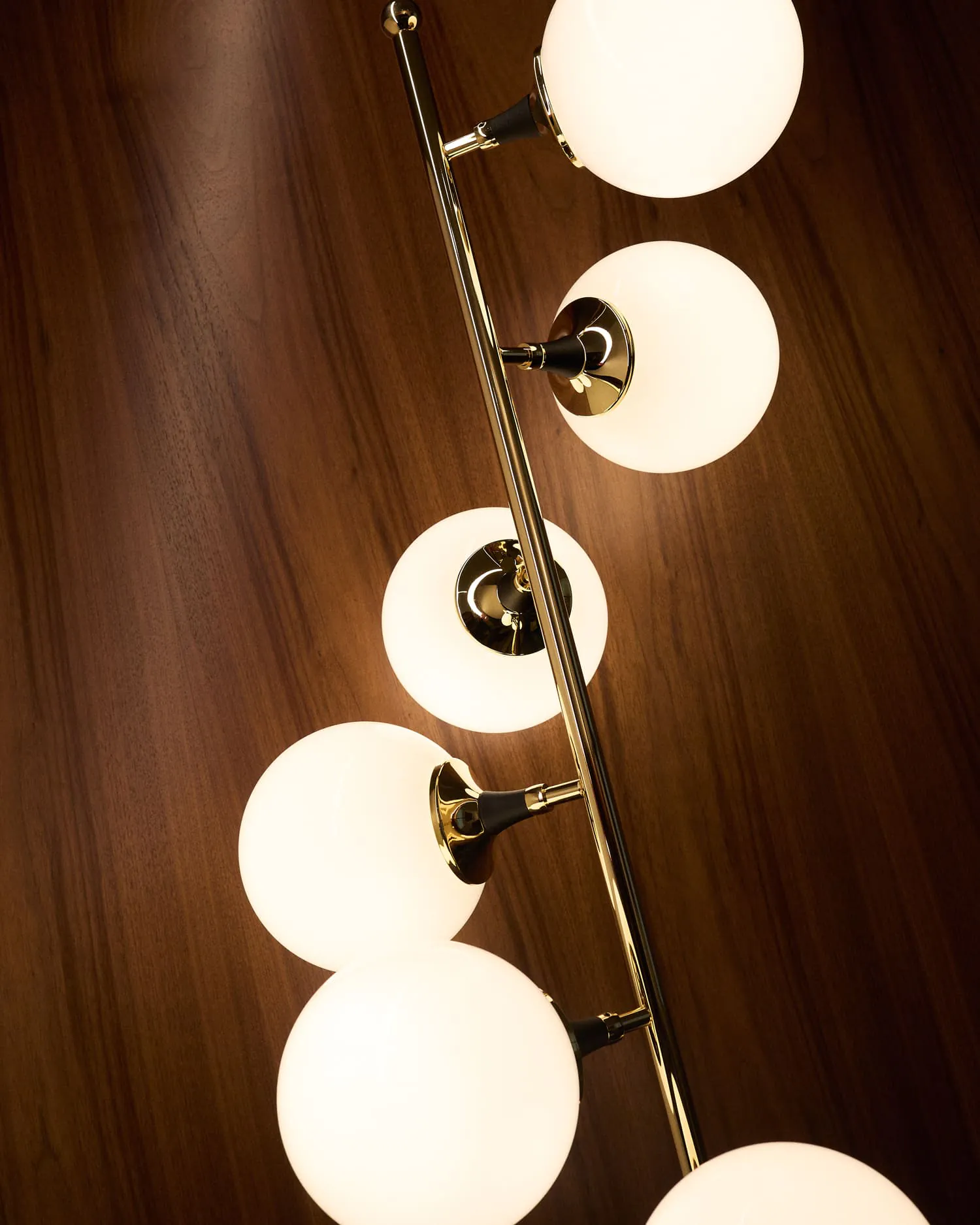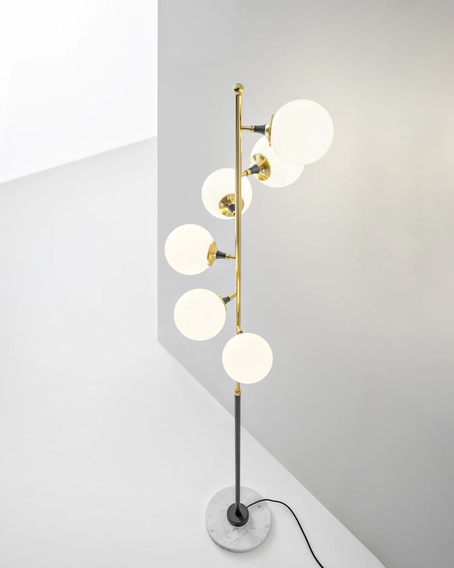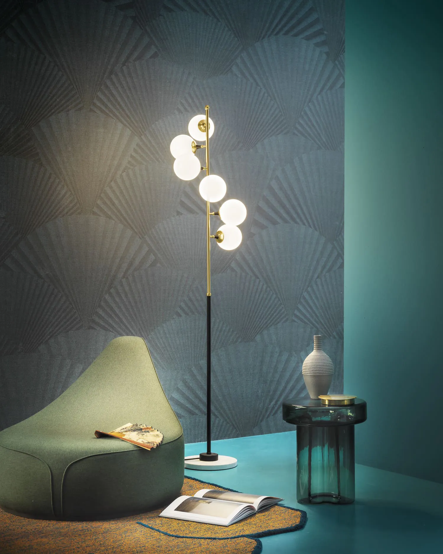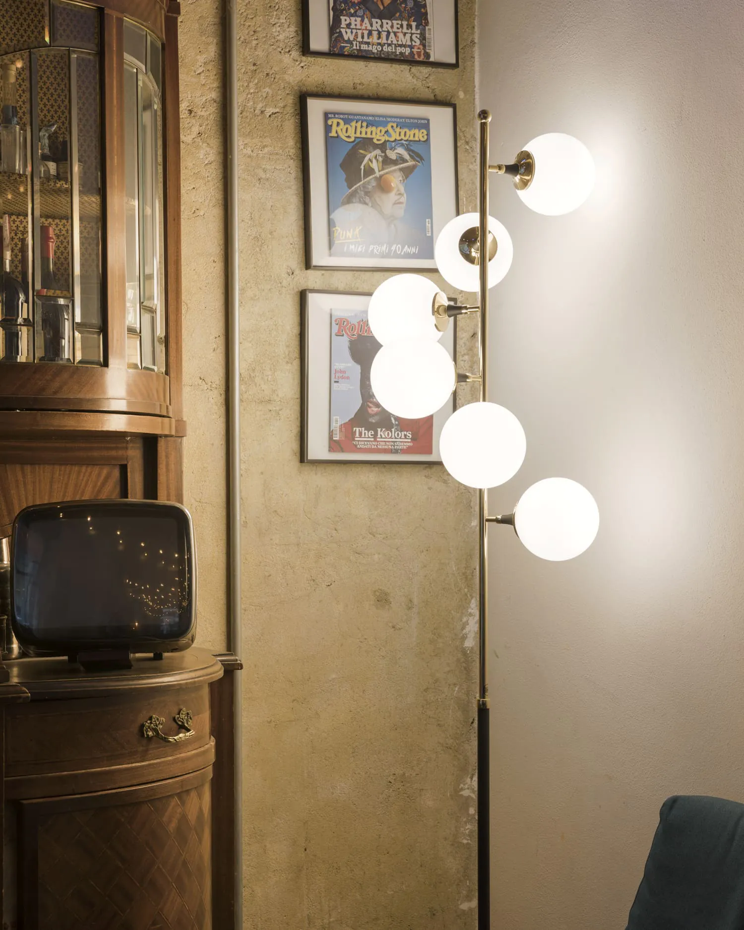 La piantana Galassia trasforma ogni ambiente in un raffinato omaggio agli anni Cinquanta, epoca iconica di eleganza e avanguardia. Le sue sei sorgenti luminose, avvolte in prezioso vetro triplex bianco soffiato, si intrecciano in un movimento fluido e armonioso, evocando l’incanto delle galassie lontane e il fascino del cosmo. Le linee slanciate e i dettagli ricercati disegnano una silhouette scultorea, capace di dialogare con gli spazi più esclusivi, dal salotto borghese alle architetture contemporanee.